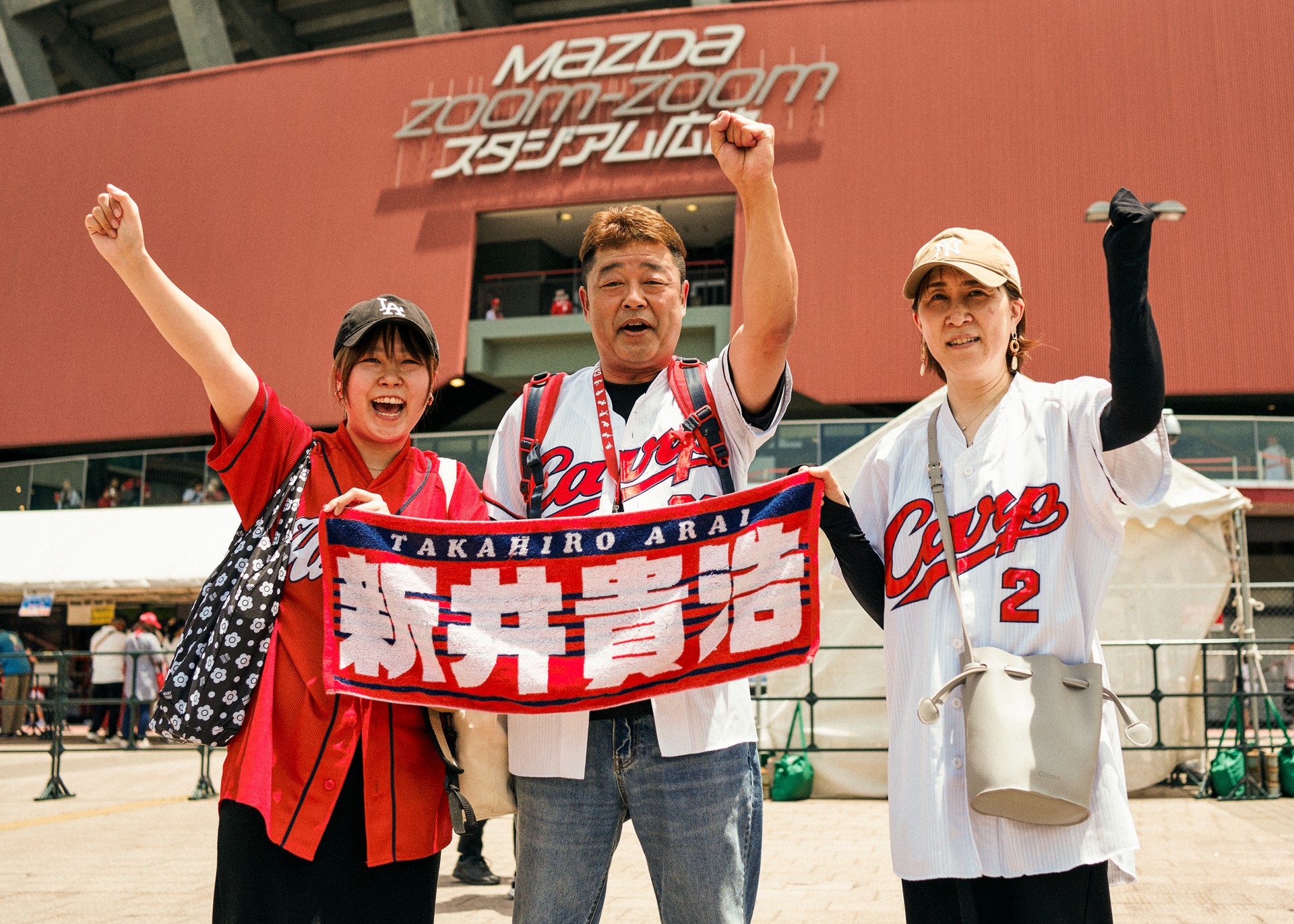 Friends Yuta Hashimoto, Chiharu Nagai, and Hikaru Sato at the Mazda Zoom-Zoom Stadium Hiroshima.
